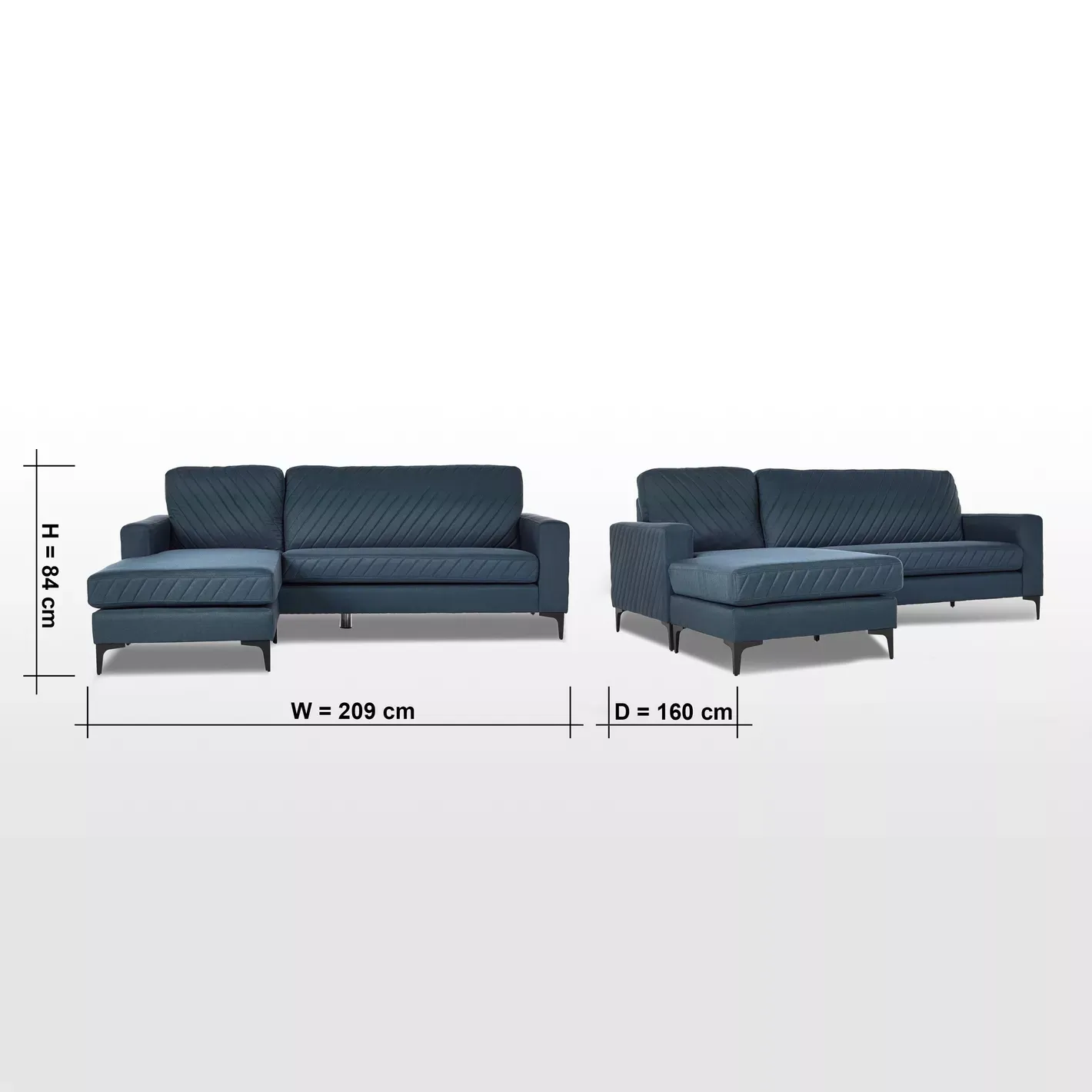 تتميز الكنبة بأبعادها المتوسطة، حيث يبلغ عرضها 209 سم و ارتفاعها 84 سم وعمقها 160 سم.