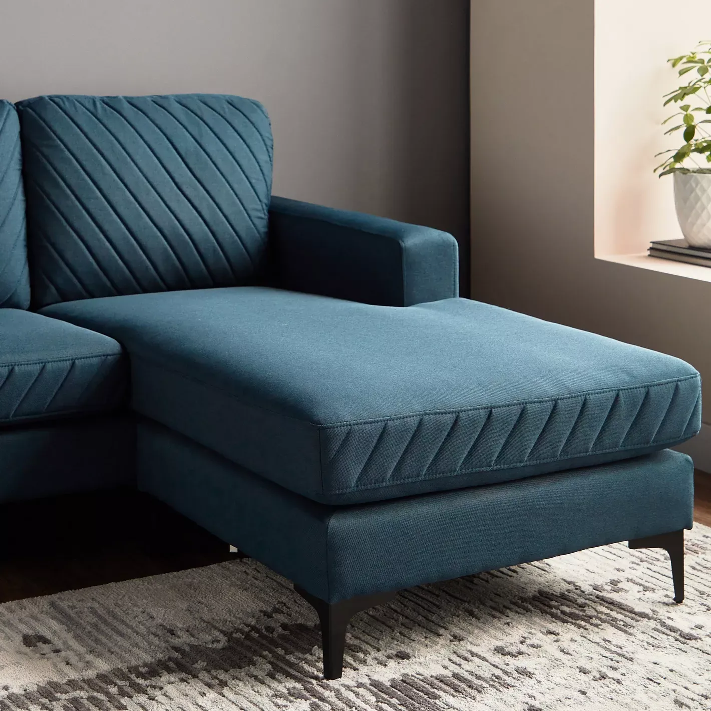 كنبة زاوية تتميز بتصميم عصري وأنيق، حيث تتكون من قطعة واحدة على شكل حرف "L".
